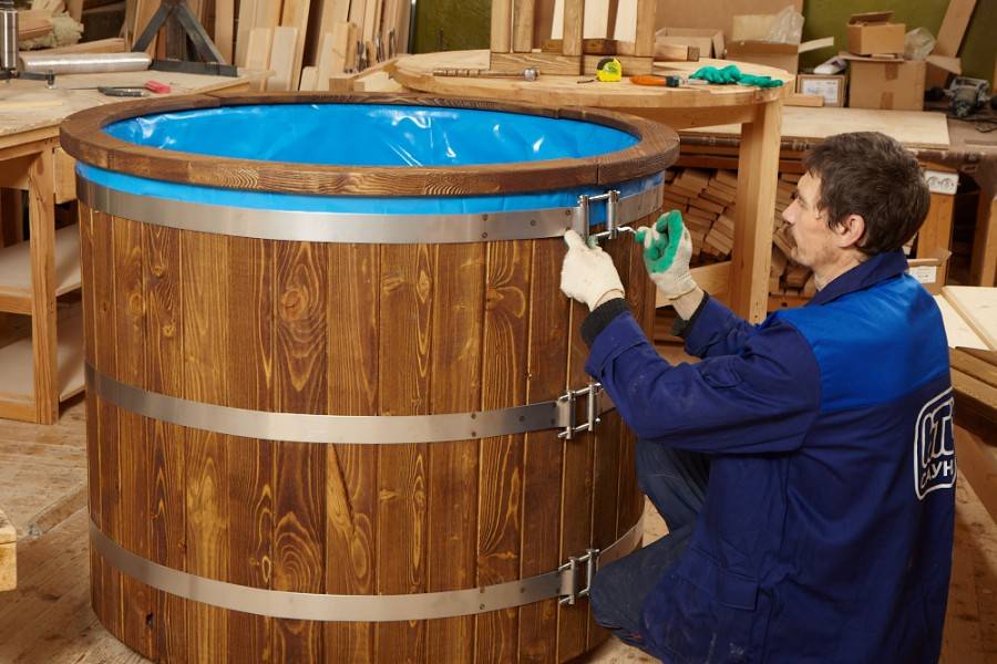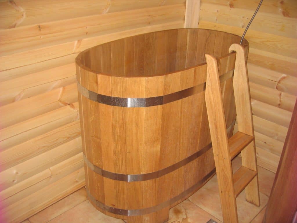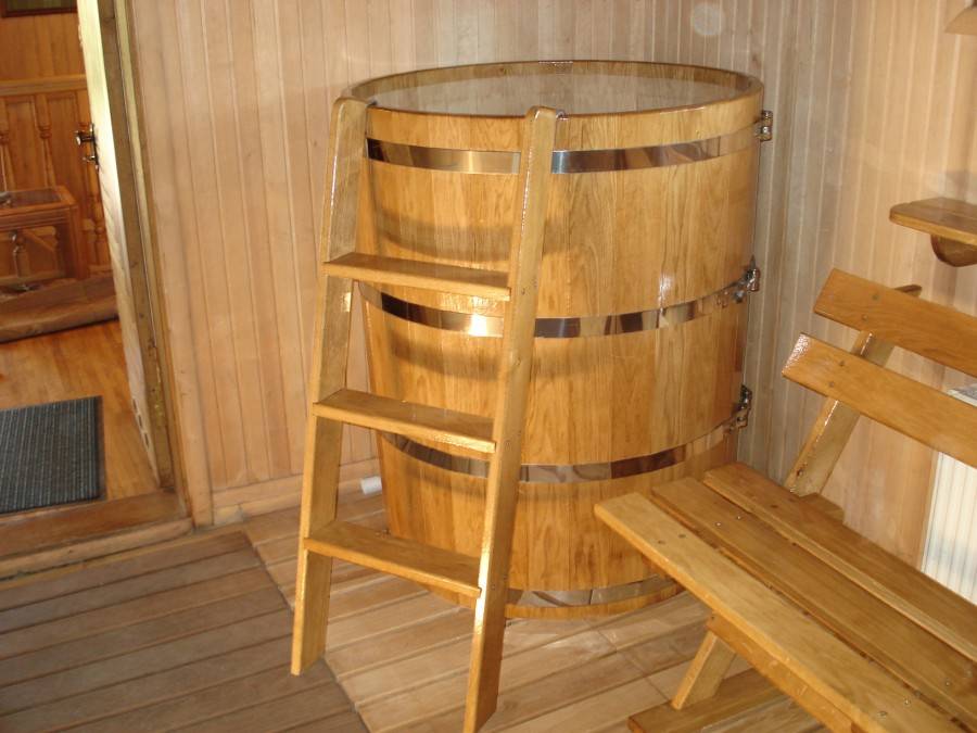 - Дерево. Из этого материала изготавливают бочки разных объемов, в которые погружаются банщики после посещения парилки. Поскольку древесина гниет при длительном воздействии влаги, перед изготовлением емкости материал пропитывается защитными составами.