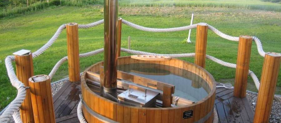 При обустройстве купели с внутренним подогревом используется специальная дровяная печка герметичной конструкции. Дверка для закладывания дров располагается в верхней части теплогенератора. С боку имеется отверстие для поддува с выходом наружу.