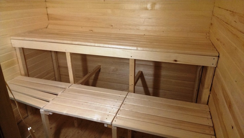 Полки не должны располагаться вплотную к стенам. Между настилом и стеной требуется просвет около 1 см, чтобы обеспечить циркуляцию воздуха в парилке.