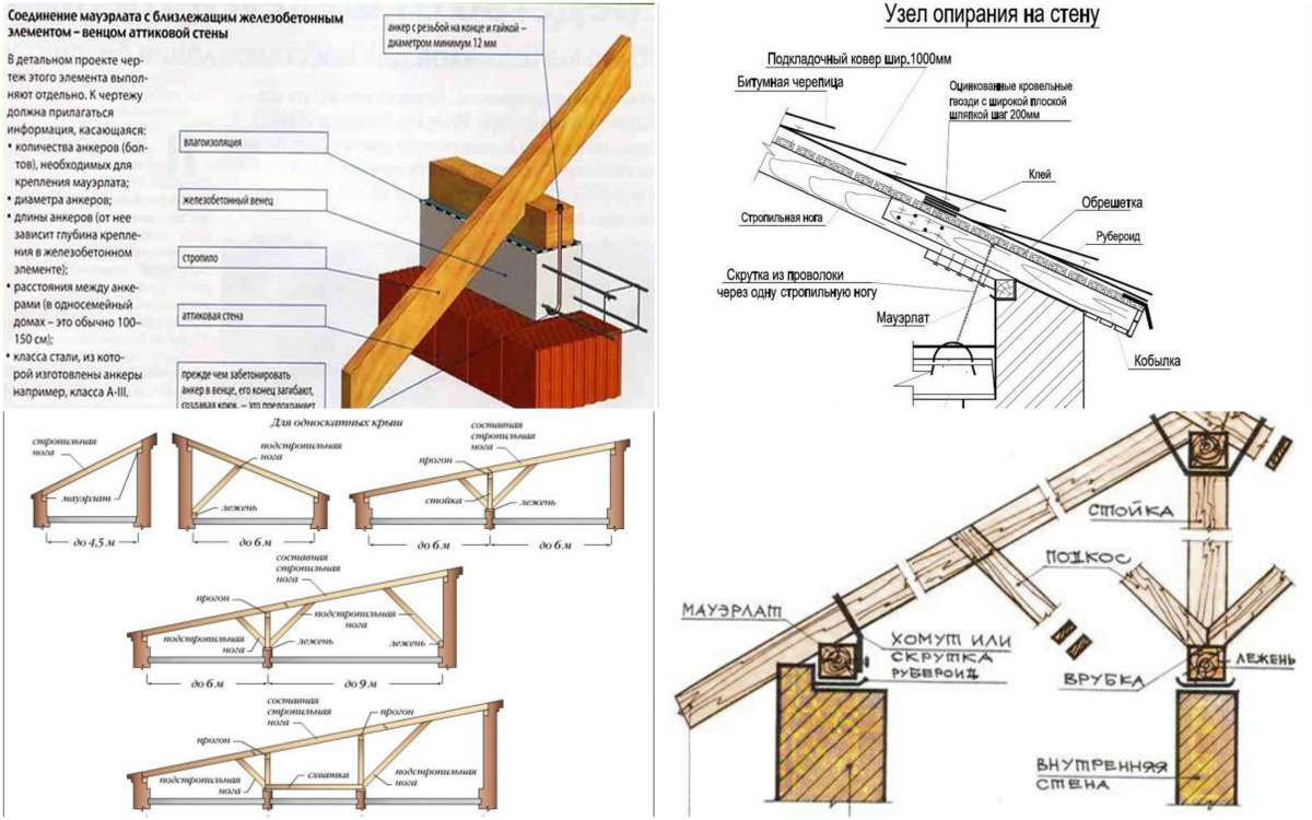 В ноге стропильного бруса прорезаются специальные пазы, которые под наклоном должны упираться в мауэрлат. Расстроение между стропилами должно быть не больше метра, лучше 60 — 90 сантиметров. Крепление стропил к мауэрлату осуществляется с помощью гвоздей или металлических уголков.