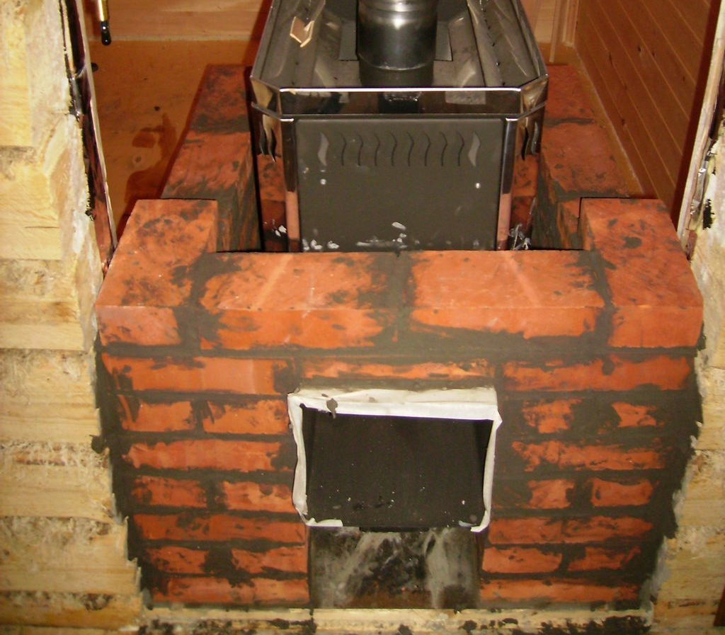 Снизить потерю тепла и повысить скорость нагревания помещения поможет кирпичная облицовка. Кладка выполняется только на глиняный раствор с добавлением шамотной крошки или порошка. Пропорция — 2х2х1. Кирпич используется 65 мм.