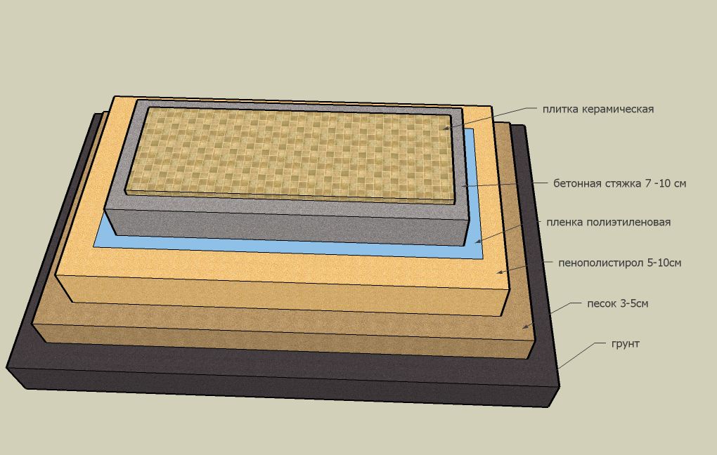 После того, как гидроизолятор схватится, начинается укладка утеплителя. Поверх него опять наносится клеящий состав, на который укладывается гидроизолятор. Последний слой – армированная бетонная стяжка, толщиной не менее 30 мм. Бетон необходимо выровнять и как следует просушить. Финишная отделка такого пола обычно делается с применением керамической плитки. Под ней можно расположить систему теплый пол.