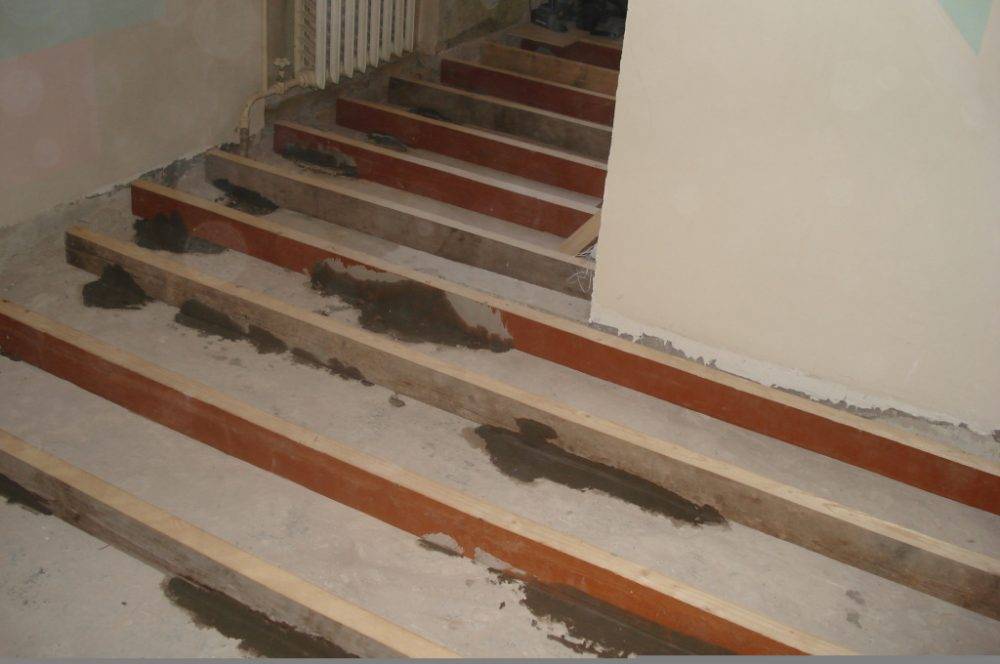 Итак, если лаги были полностью демонтированы, необходимо установить новые. Для этого берут прочные деревянные рейки или брус, обрезают по размеру пола, грунтуют антисептическим раствором и просушивают. Высота деревянного каркаса для пола должна быть минимум 10 см. Крайние рейки крепят на расстоянии 2-3 см от поверхности стен, между остальными делают промежуток от 0,5 до 1 метра. Каждую рейку нужно выставить по уровню и параллельно другим, чтобы ни одна деталь не выступала из горизонтальной плоскости.