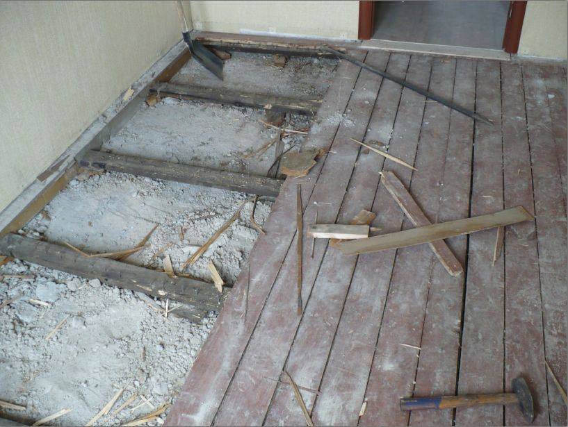 Если лаги очень старые, расшатанные и прогнившие, убирают все до бетонной основы