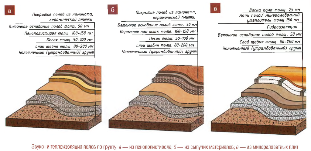 Для утепления пола по грунту следует снять плодородный слой, подровнять землю и основательно ее уплотнить. На утрамбованный участок насыпают слой щебня и песка. Таким образом, происходит дополнительное выравнивание поверхности.