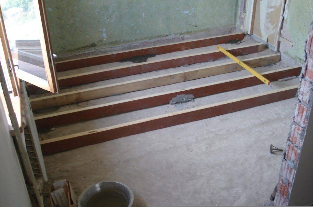 Высоту теплого слоя равняют по маячкам. Готовую подушку заливают цементным составом. После застывания сверху делают полноценную стяжку. По желанию на лоджии и на закрытом балконе поверх стяжки можно настелить деревянный пол.