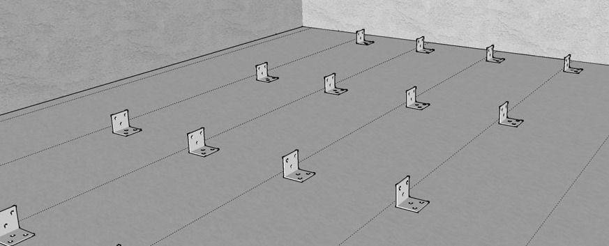 К полу рейки прикручивают шурупами с помощью металлических угловых пластин, одна сторона которых прилегает к дереву, вторая — к основанию пола. Крайние крепежи располагают в 2-3 см от торцов реек, все последующие – с шагом 50 см.