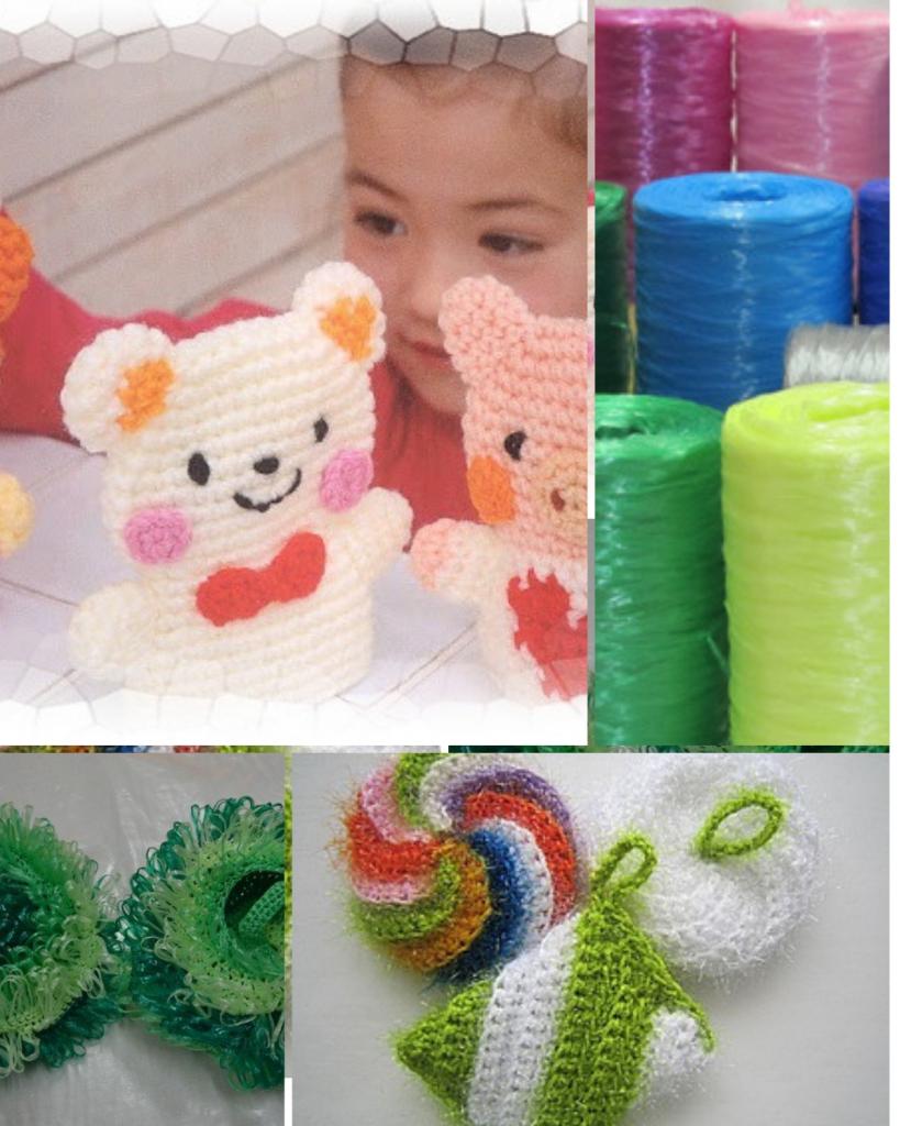 Некоторые рукодельницы умудряются вязать мочалки даже из полиэтиленовых пакетов. Пакеты для мусора сейчас выпускаются ярких расцветок, и если выбрать самые мягкие, то наверное такие мочалки имеют право на существование. Особенно этот способ актуален для тех, кто не смог купить в магазине полипропиленовые нитки, а связать мочалку очень хочется. Формы мочалки и способы вязания будут такие же, как и из полипропиленовой пряжи.