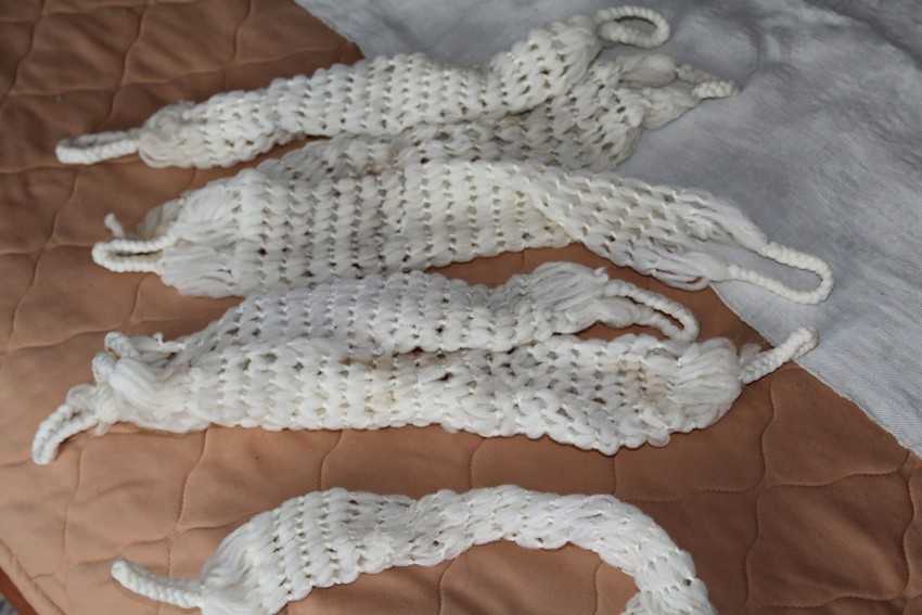 Если же вы планируете создать фигурную мочалку — круглой, квадратной формы или в виде варежки для бани — тогда вам понадобятся лишь две спицы. Но в этом случае предстоит связать 2 одинаковые половины мочалки, которые затем нужно сшить. Новичкам, возможно, будет сложно справиться с чулочными спицами, чтобы создать бесшовное изделие, потому они могут остановить свой выбор на двух спицах.