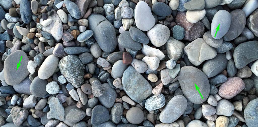 Пригодность для бани речной и морской гальки зависит от ее происхождения. Галька, не вымытая из ледниковых отложений, а обвалованная водой в историческое время, испытаний на пригодность в баню может не выдержать. Поэтому из естественных залежей гальку на проверку нужно брать сразу серую, хорошо окатанную, без пор, щербин и посторонних включений. Набрать такой и на богатой россыпи, да еще и подходящего размера (1-2 кулака), не так-то просто (показано зелеными стрелками на рис.); иногда легче бывает найти большой пашенный валун и расколоть.