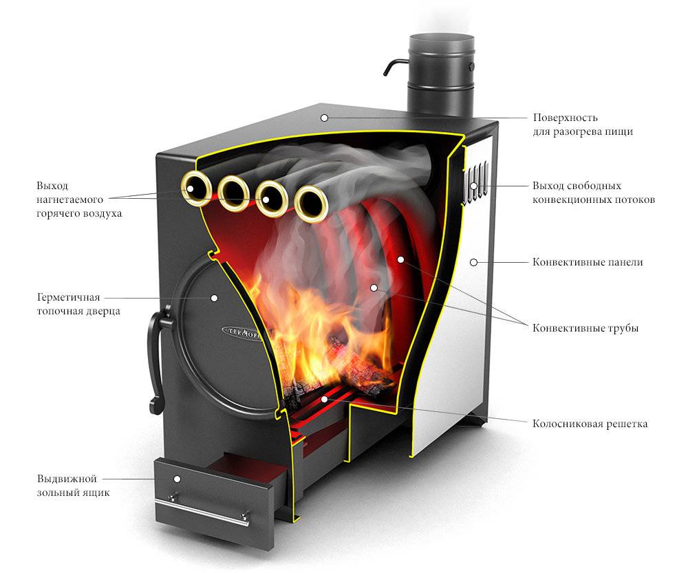 Печи длительного горения сжигают топливо очень медленно. Из-за того, что воздушные потоки в них регулируются, дрова в них не горят, а только тлеют. Камера сгорания в таких печах полностью герметизирована, а воздух в нее поступает принудительно. К преимуществам данных печей можно отнести: