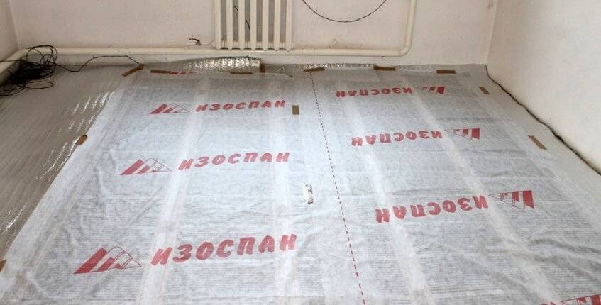При изоляции пола пленка укладывается на бетонную или цементную стяжку. Полотна монтируются внахлест. Кроме того, небольшой заход нужно оставить и на стены. Достаточно 10-15 см.