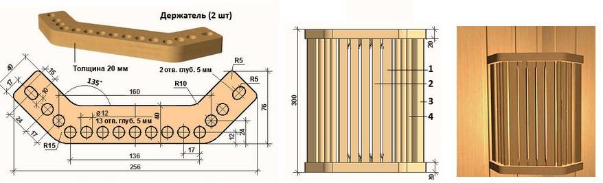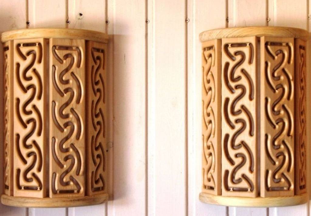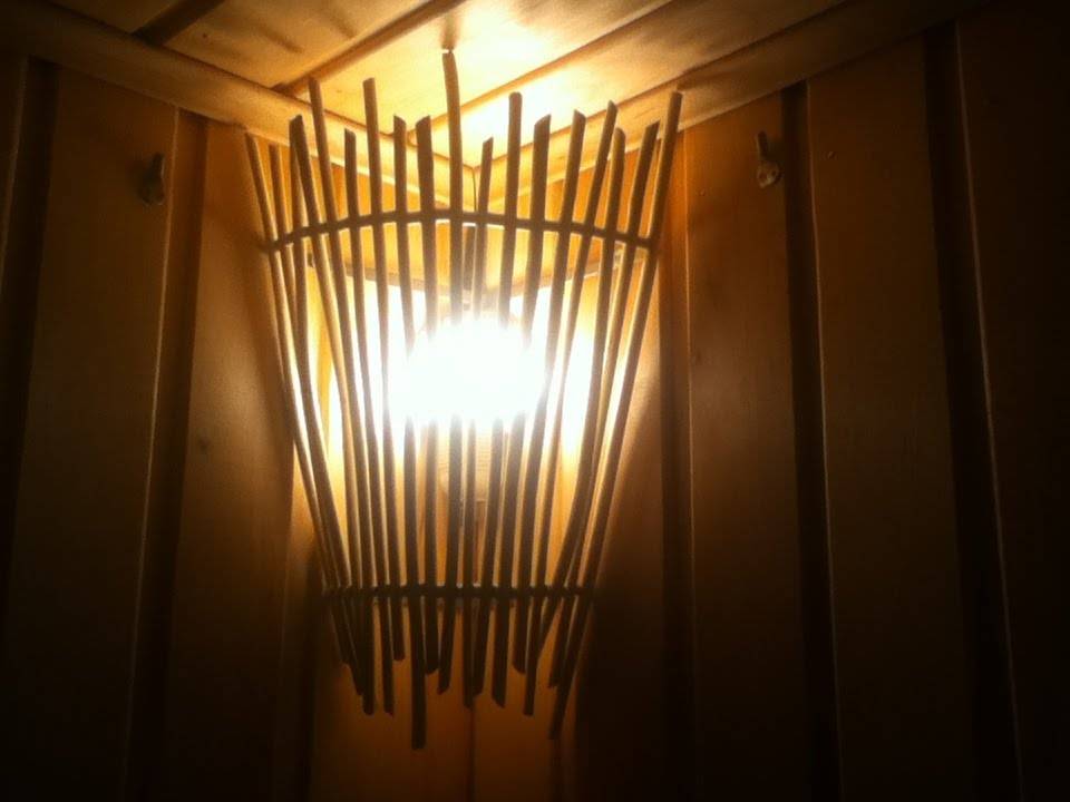 Поверх основы на шурупы, саморезы и/или мелкие гвозди крепятся деревянные рейки. Их можно расположить под углом, вертикально и т. п. Если проявить фантазию, получится стильное бра, которое украсит интерьер банного помещения.