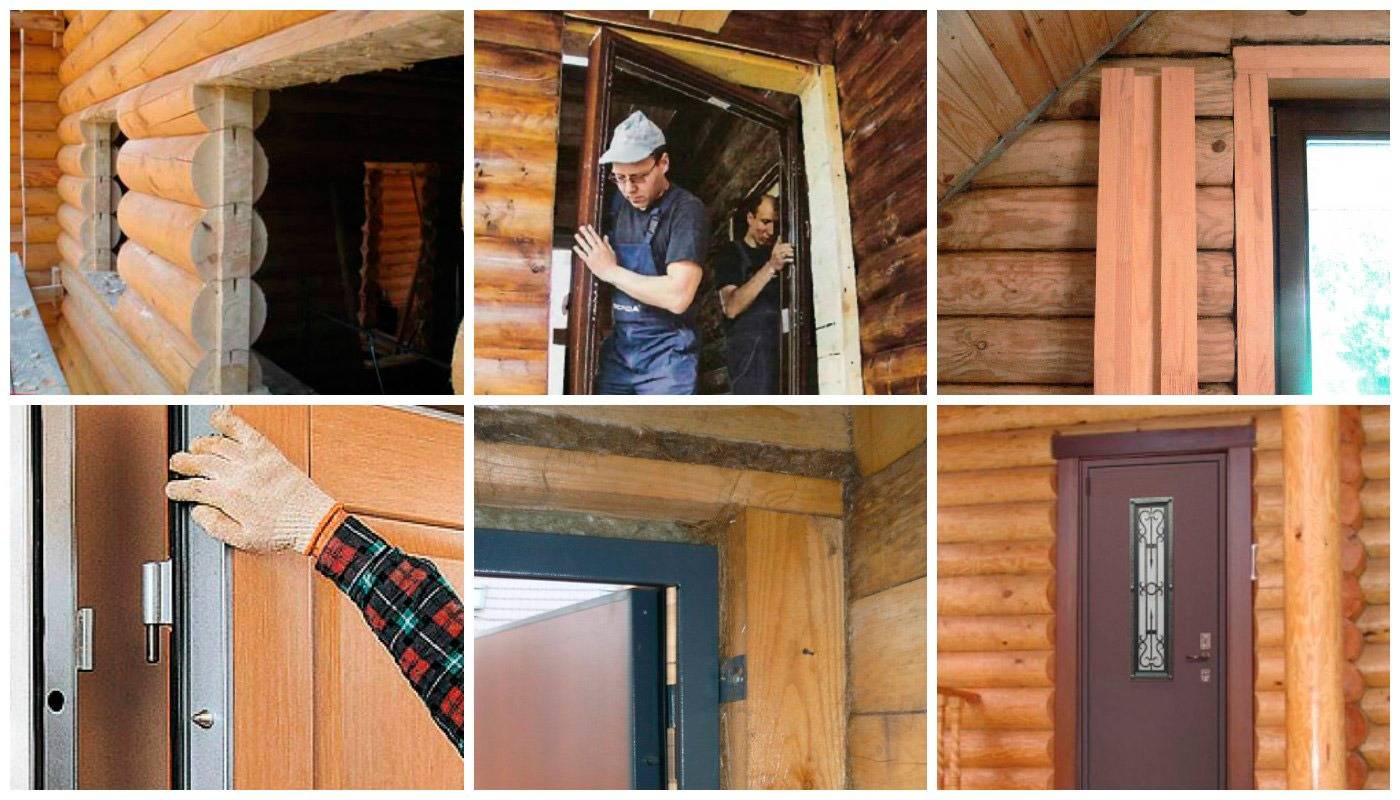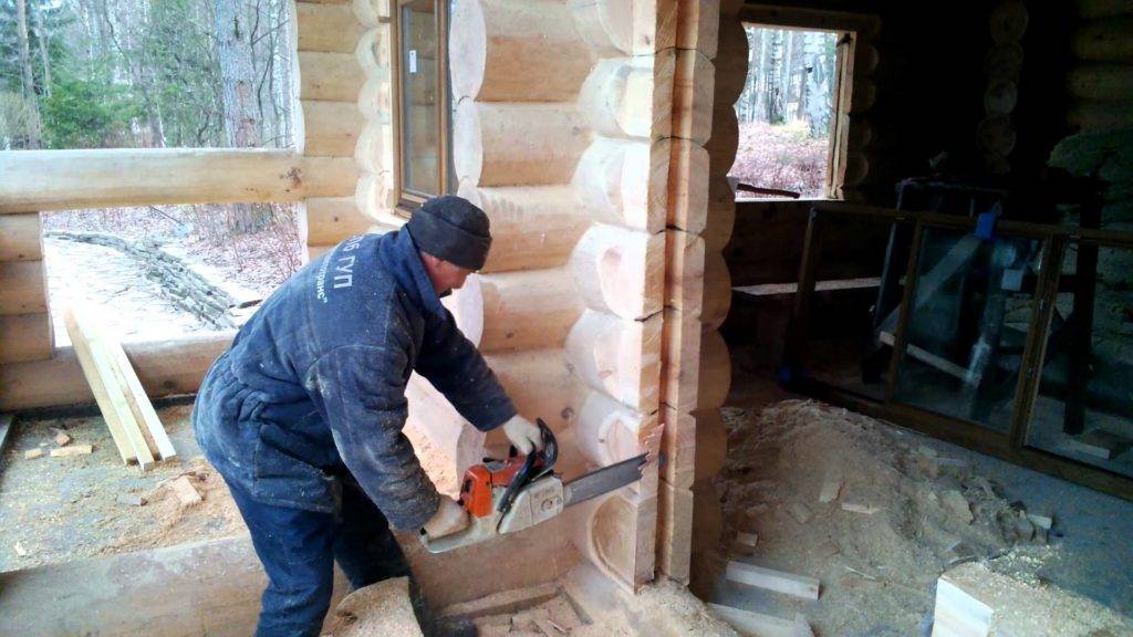 При выпиливании в срубе проема происходит ослабление кладки бревен. Поэтому по торцам проема делаются шипы с помощью стамески и бензопилы. На них надеваются вертикальные элементы коробки. Дальше поступают следующим образом: верхняя перемычка соединяется в шип со стойками, коробка выравнивается с помощью строительного уровня и клиньев, конструкция крепится анкерными болтами. Порог устанавливается в последнюю очередь.