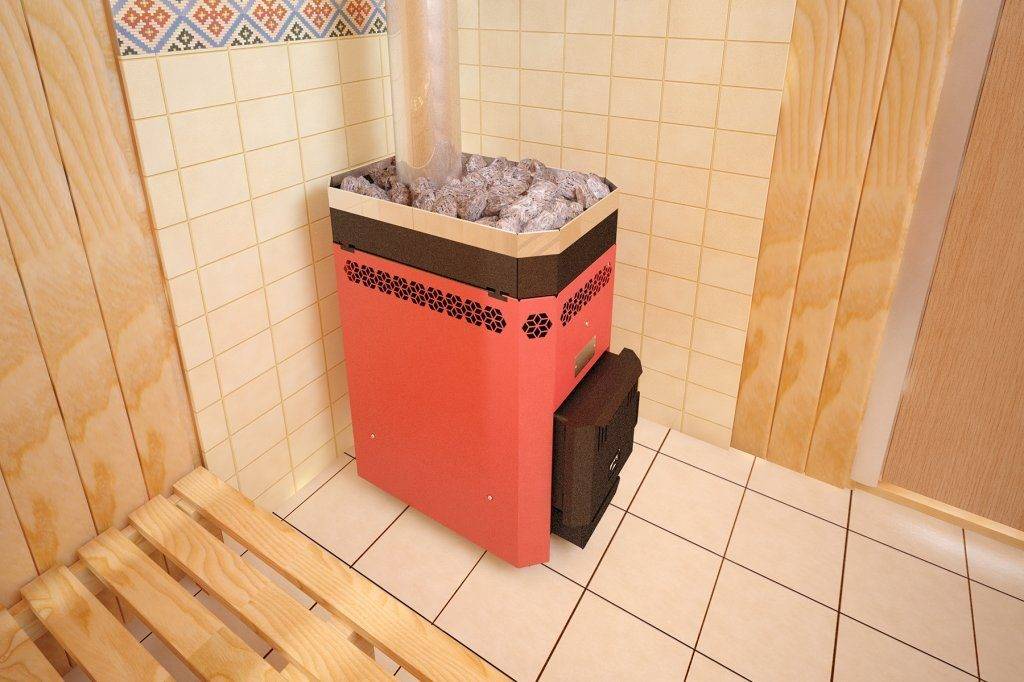 Над печью устанавливается каменка, где укладываются камни. Желательно подобрать такие, чтобы вес их был ниже 200 кг. Прогрев будет проходить быстрей. Сбоку делается окно для плескания туда воды. Желательно вверху, над каменкой, сделать крышку. Можно использовать для этого жесть. Будет открываться, выпускать пар, когда это требуется.