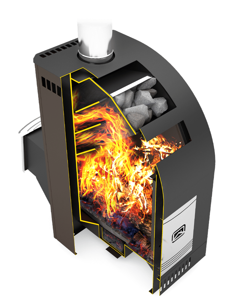 Высокая печь с просторной футерованной топкой, в которую встроен емкий теплообменник в виде баллонов. Засыпанные в них камни повышают температуру воды на выходе из теплообменника и позволяют ей оставаться горячей в течение нескольких часов после завершения процесса горения.