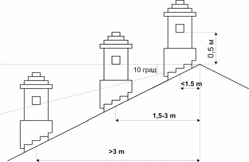Соотношение высоты дымоходной трубы с параметрами кровлиИсточник kaminbrick.ru