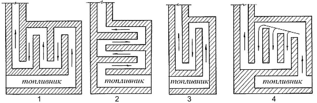 - Последовательный ход с короткими вертикальными каналами. Наименее материалоемок и наиболее прост для постройки. Сопротивление току газов наибольшее. Компактность и теплоэффективность печи средние. Чаще все применяемая схема;