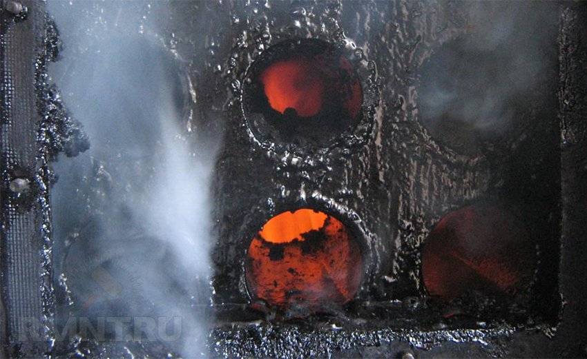Дело в том, что все дровяные котлы страдают общей болезнью — образованием дёгтя из-за высокой влажности сжигаемой древесины. Конденсация происходит только при достаточно высокой разнице температур. Так, образование наростов на экономайзере или вторичном теплообменнике может прекратиться при нагреве теплоносителя до 40-45 ºС. Суть здесь в том, что если загружать котёл наполовину, его мощности не хватит для нормального нагрева стенок и теплообменников, из-за чего оборудование попросту «потечёт».