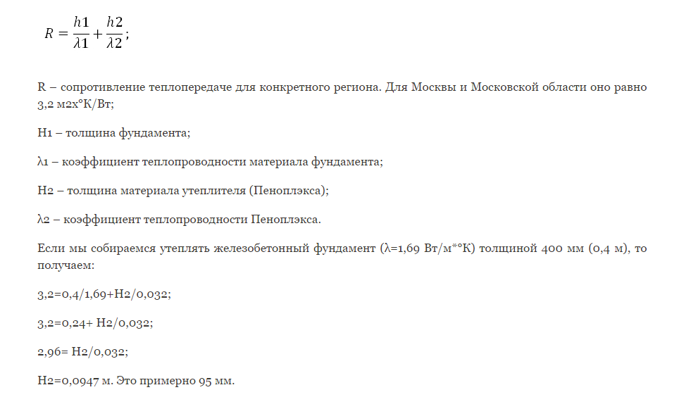 При желании можно самостоятельно произвести необходимые расчеты потребности утеплителя под фундамент дома пеноплексом, применив для этого следующую формулу по сопротивляемости и теплопроводности: