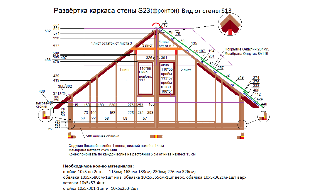 Закрытие плоскости фронтона осуществляется при помощи отделочного материала. В качестве стройматериала для проведения отделочных работ может служить вагонка. Обшивка фронтальной плоскости должна осуществляться с запасом, который обеспечивает выступ отделочного материала за плоскость фронтона на расстояние 20-25 мм.