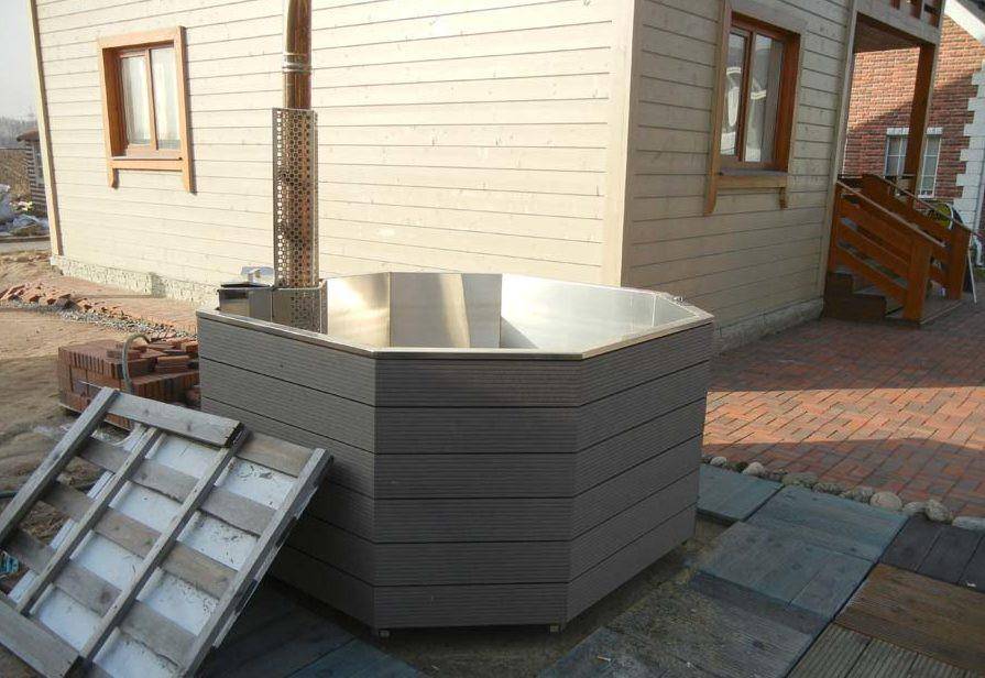 В последнее время большую популярность стали приобретать купели из других материалов. Разрабатываются даже проекты с пластиковыми конструкциями. Их экстерьер изначально не самый привлекательный, но внешне они декорируются под древесину, что позволяет им отлично вписаться в интерьер. Также пластиковые ванны отличаются простотой ухода и продолжительным сроком эксплуатации.