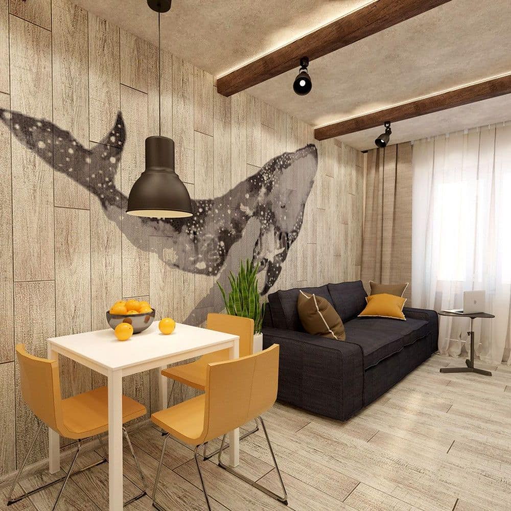 Можно ориентироваться на доминирующий тон мебели. К примеру, если при помощи ламината оформить контрастную стену, удается создать гармоничную обстановку, с уютным и расслабляющим интерьером.