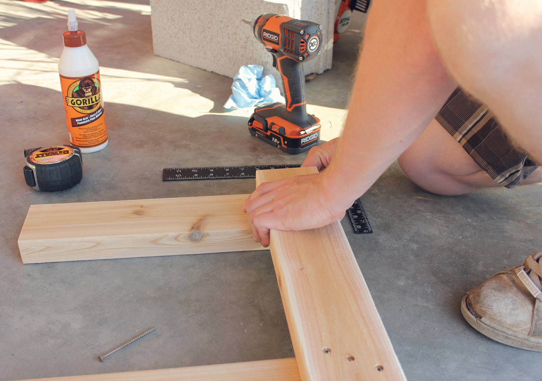 - К каждой ножке на расстоянии в 150 мм от пола крепим распорный брусок.