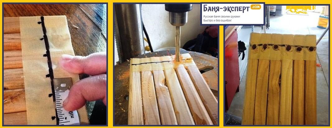 Шаг 2. В каждой заготовке необходимо просверлить по два аккуратных отверстия. Чтобы упростить этот процесс, можно уложить 6-7 брусков плашмя друг на друга, подровнять с торцов по линейке и обмотать скотчем по краю. С другой стороны бруски так же скрепляют скотчем. Теперь они прочно зафиксированы и не сдвинутся при сверлении. Прямо на скотче маркером ставят метки для отверстий и начинают сверлить. Диаметр отверстия делают на 2 мм больше, чем диаметр прутка. Так просверливают все заготовки.