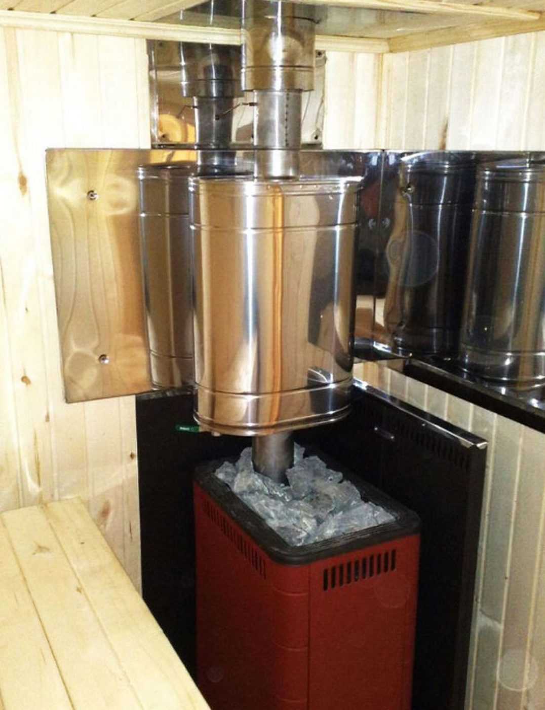стоит учесть, что дровяная каменка очень сложна в закладке, а потому лучше всего сделать выбор в пользу электрических печей, которые можно приобрести во многих магазинах. Размещается такая печь с зазором от пола в 20 сантиметров, а к стене крепит шурупами;
