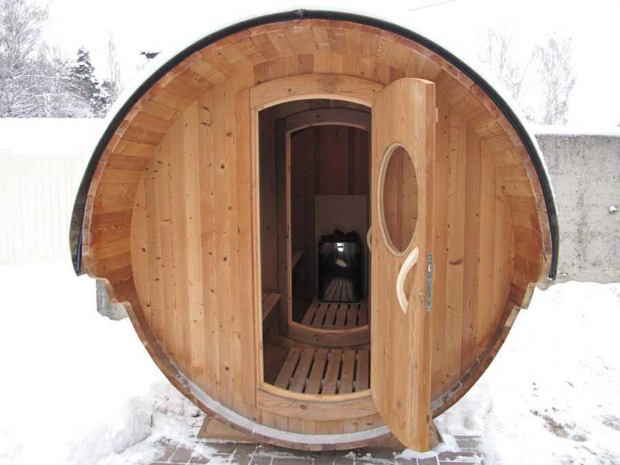 Также можно приобрести баню-бочку, состоящую только из парилки. Но и в ней при желании можно найти место для душа и вывести слив с поддона на улицу. Такая баня не займет много места.