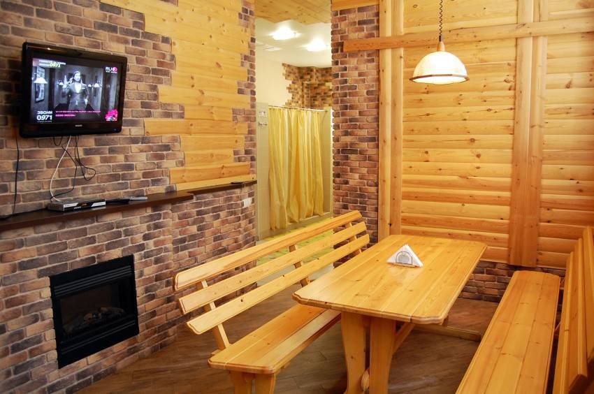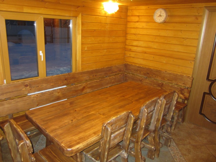 В бане комната отдыха выполняет свое предназначение буквально. Здесь отдыхают между подходами в сауну, пьют чай после парилки. Мебель для бани из дерева потребуется следующая: