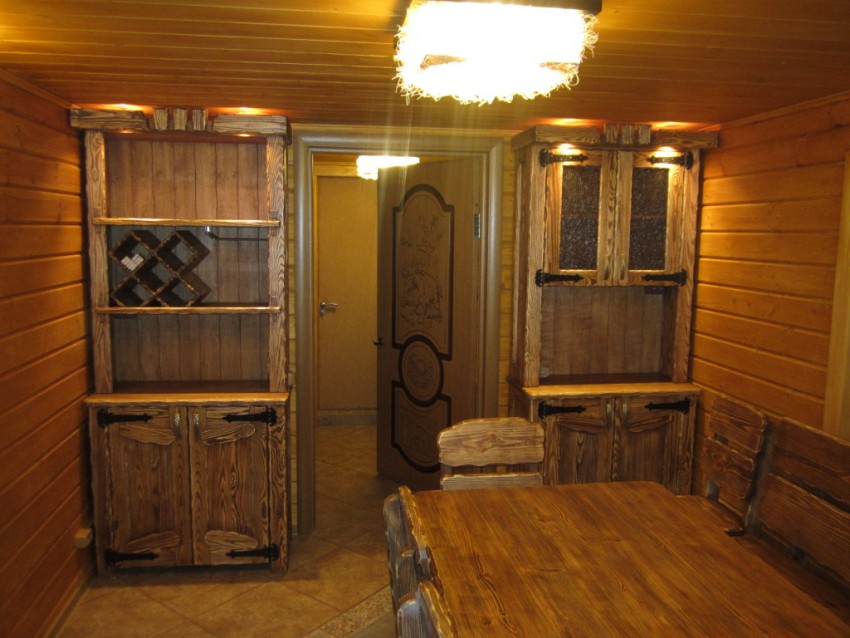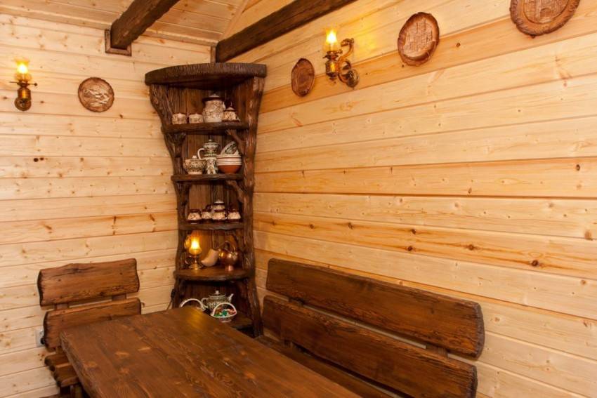 В комнате отдыха практически всегда требуется и деревянная мебель служебного характера, например, полки на стенах для посуды или банных аксессуаров, этажерка для тех же целей. Закрытый шкаф лучше не использовать, так как он громоздкий и создает ощущение тесноты.
