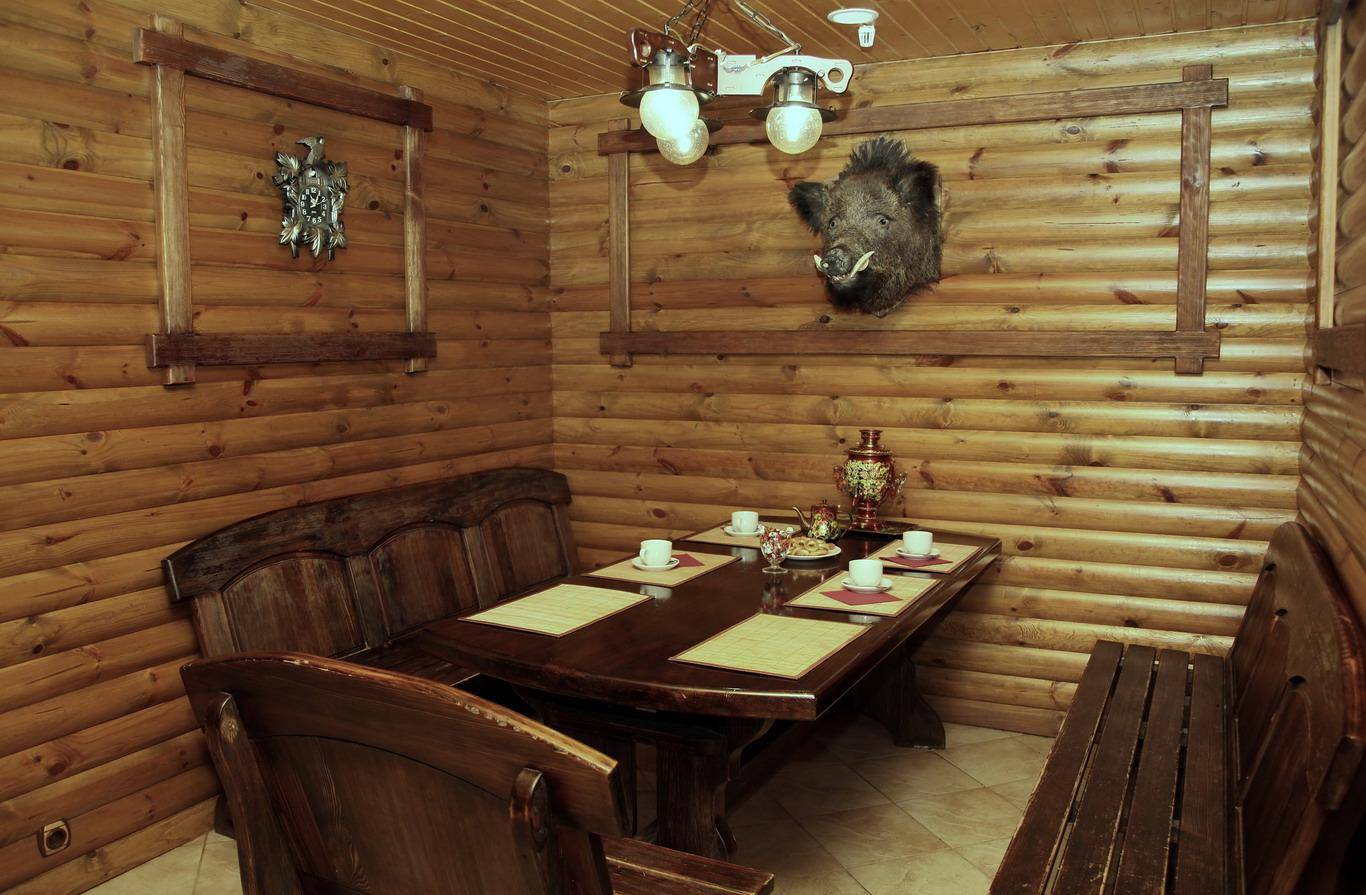 Стандартный комплект мебели для комнаты отдыха представлен столом, лавками, деревянными топчанами, полками, стульями или табуретами.