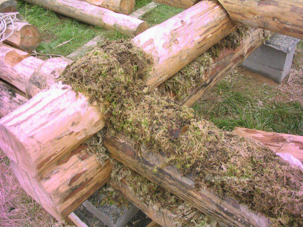 Но перед укладкой между венцов его придётся немного намочить, т.к. сухой мох сильно крошится, работать с сухим неудобно.