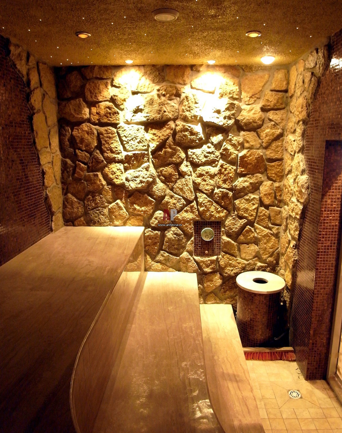 Богато и презентабельно выглядят комнаты отдыха, отделанные камнем. Этот материал не только обладает прекрасным внешним видом, но и не боится влажности, высоких температур и механических повреждений. Чаще всего стены в банях декорируют гранитом, булыжником, песчаником или мрамором.