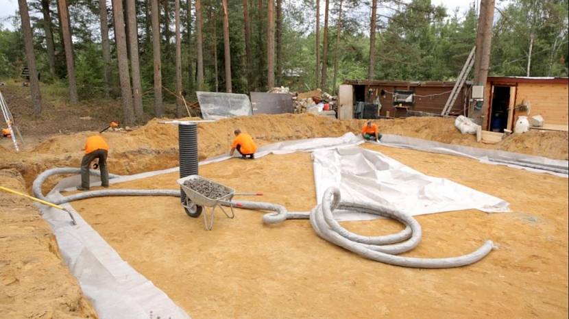 Схема дополняется дренажным кольцом по периметру и отмосткой с подложкой из утеплителя. Как правило, чтобы исключить смешивание нерудных материалов подушки с землей, дно грунта укрывают геосинтетической тканью.
