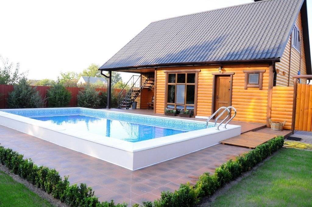 Такому сооружению потребуется прочный фундамент из монолитного железобетона. Саму баню чаще строят из бревна или бруса. Рядом с бассейном заливают полы из бетона. В санузле, душевой и на кухне лучше положить керамическую плитку. В парной, прихожей и комнате отдыха – только доски.