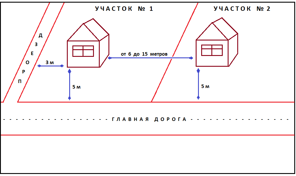 - от центра улицы в поселке или автотрассы до строения на территории должно быть не менее 6 м;