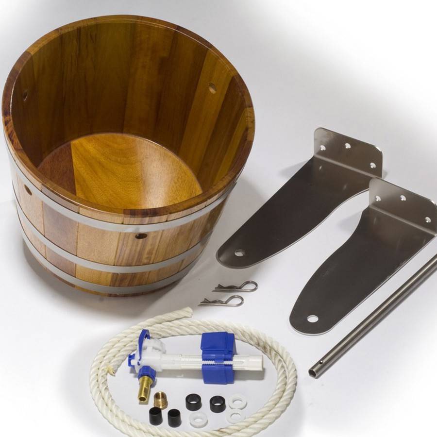 - модернизированное ведро обливное для бани – это укрепленная с помощью кронштейнов на стене деревянная емкость с поплавковой системой, через патрубок которой поставляется вода. Иногда внутрь деревянной емкости жестко вставляется пластиковый или оцинкованный вкладыш, защищающий древесину от порчи;