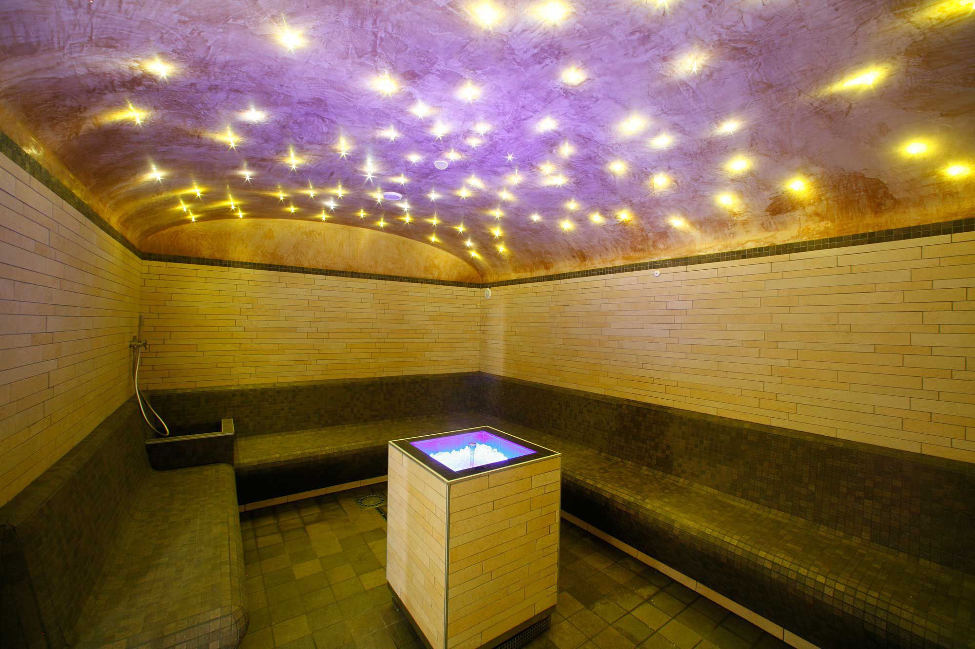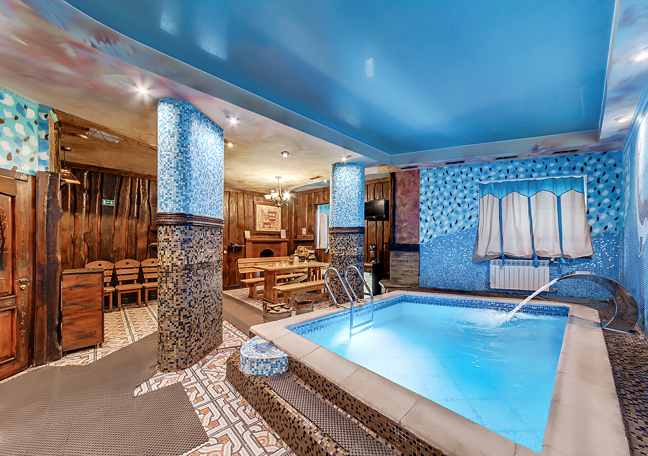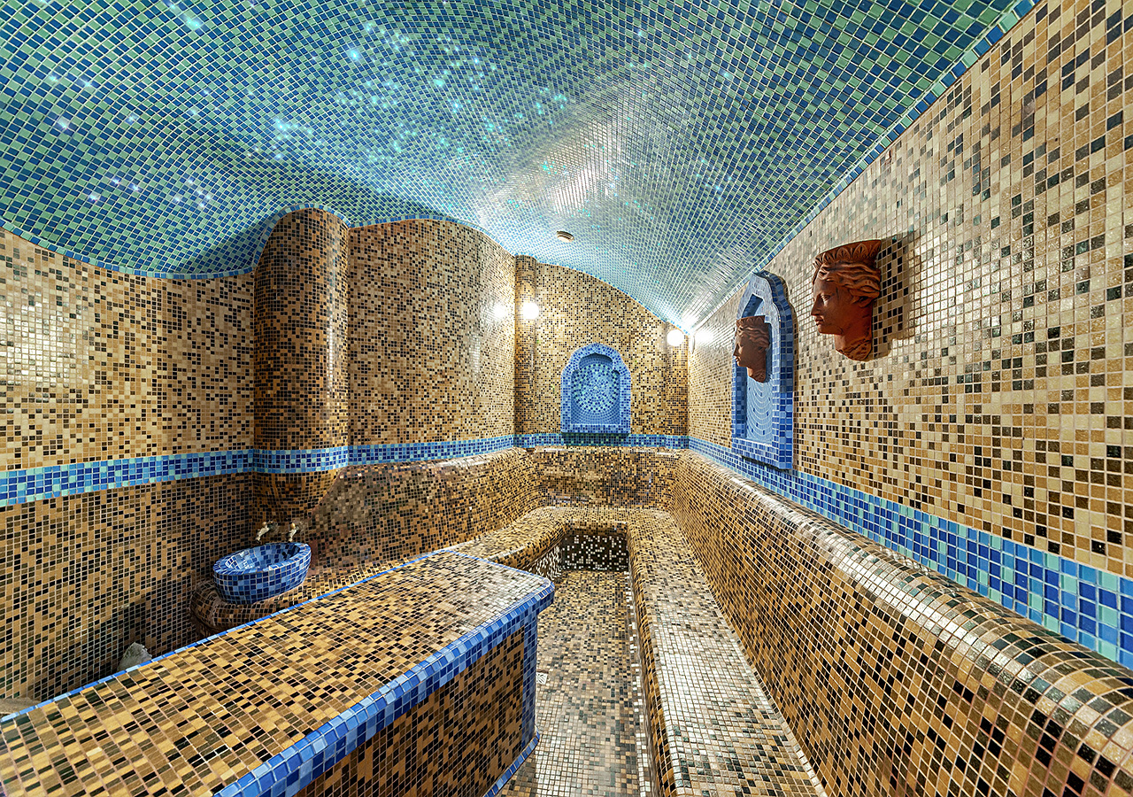 Он предусматривает много способов для расслабления души и тела: массаж мыльной пеной, бассейн из мозаики, тёплые обливания и прислуживающий персонал.