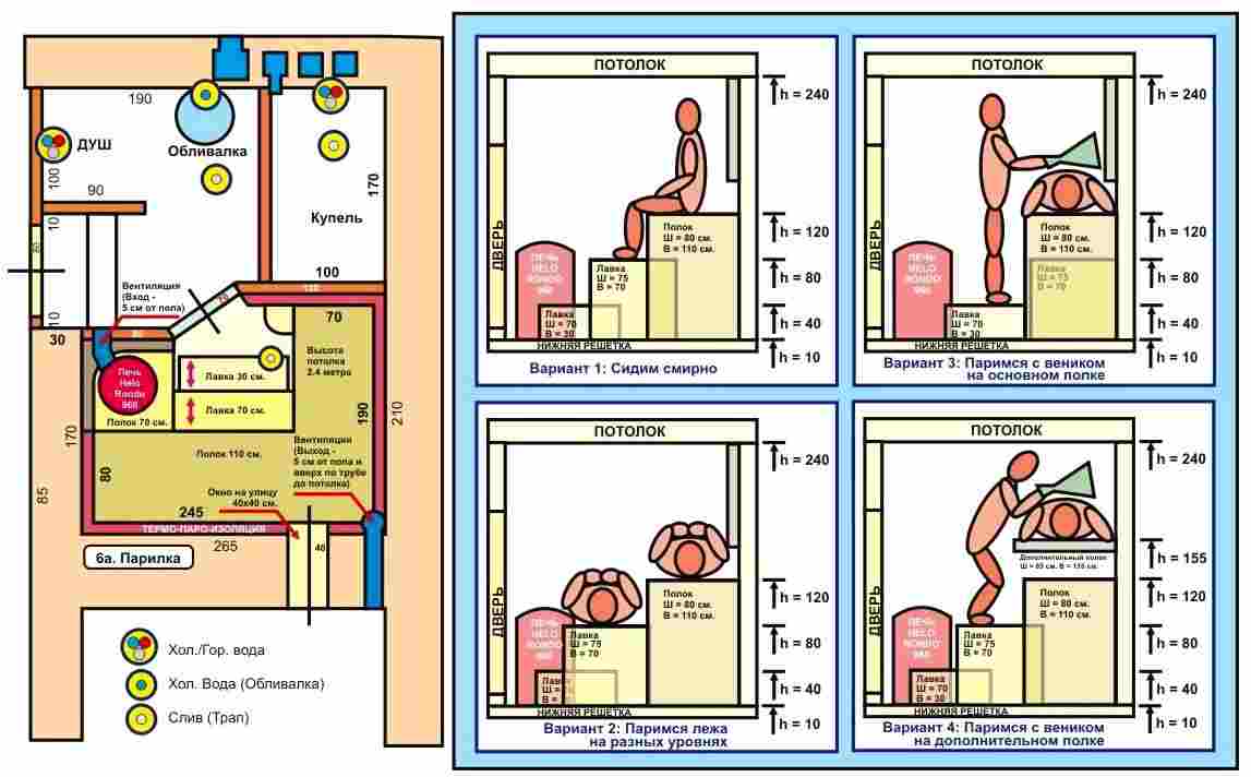 Схематичное размещение людей в бане — Оптимальная высота бани от пола до потолка
