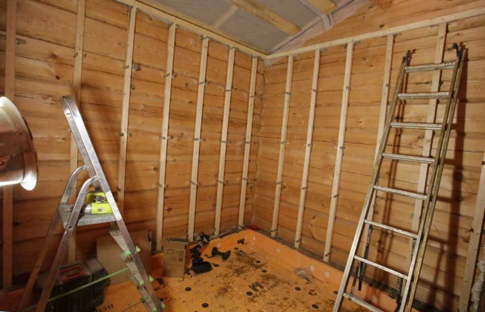 - На потолке, стенах делаем обрешетку из деревянных реек средней толщины 5‒10 см (точная цифра зависит от толщины утеплителя).
