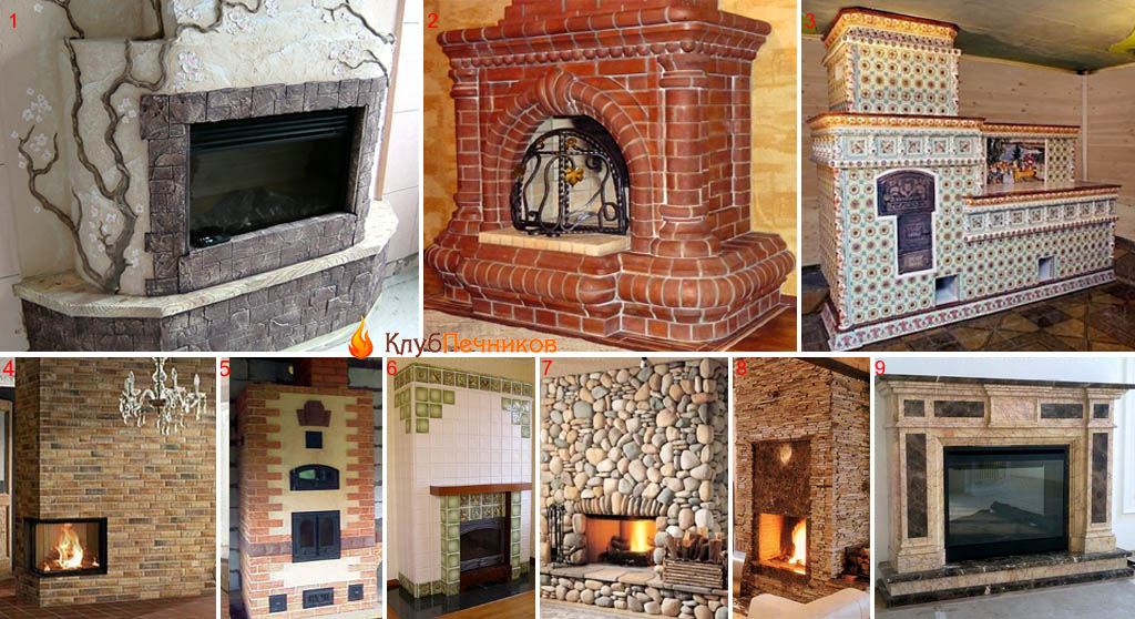 Внешняя отделка металлических печей с одной стороны, проще, т.к. металл пластичен, упруг, и отслоившуюся облицовку нередко удается поправить на ходу прибора. С другой стороны, сложнее вследствие большого ТКР металла и высокой температуры тела печи. Поэтому металлические печи чаще всего красят жаростойкими эмалями; одно, но существенное исключение будет рассмотрено далее, мы же займемся в основном кирпичными отопительно-варочными приборами. Выполнить все указанные выше условия непросто, но печное дело существует и развивается тысячелетия. Печники, как и все мастера высокого класса, народ здравомыслящий, так что подходящих для своей работы достижений современных технологий как правило не отвергают. Поэтому и для любителей выбор способов облицовки камина и/или печи своими руками достаточно широк, см. рис. и список ниже: