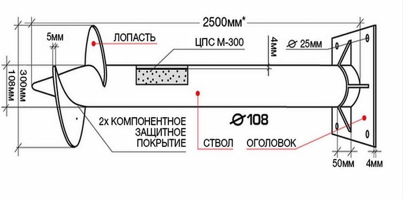 Винтовая свая представляет собой трубу с резьбой на одном конце и плоской шляпкой на другом. В зависимости от плотности грунта и особенностей ландшафта, сваи могут достигать 2.5 метров в длину. А толщина стенки колеблется от 5 мм до 15 мм. Снаружи их покрывают специальным корабельным грунтом, который защищает металл от коррозии.