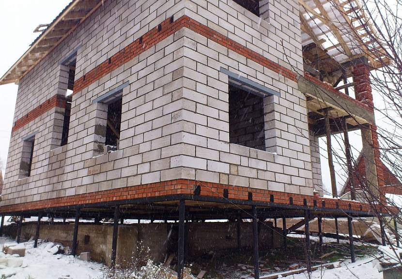 Первый вариант сложнее, а также имеет ряд ограничений. Ленточная конструкция мелкозаглубленного типа может быть из бетона или кирпича. Чаще всего она опирается на землю или свой небольшой монолитный фундамент (подробнее об устройстве мелкозаглубленного ленточного фундамента). Но при строительстве на пучинистых грунтах настоятельно не рекомендуется использовать такой вариант. Особенно если речь идет о кирпичном цоколе. В этом случае земля в зимний период приподнимается (вспучивается). Причем процесс происходит неравномерно. Откопав конструкцию цоколя от снега, в определенный момент придется увидеть наклонные трещины, которые говорят о повреждении морозным пучением.