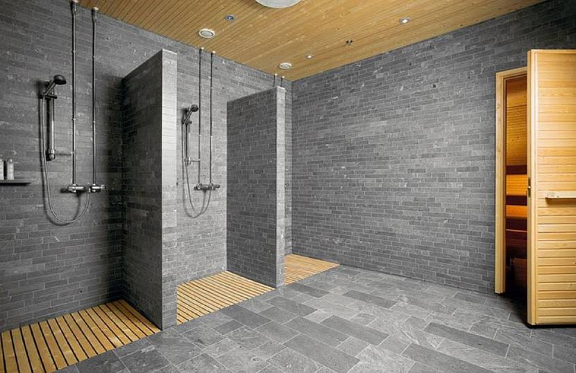 Брутальный индустриальный стиль отлично впишется в интерьер комнаты любого размера. Для дизайна душа в бане характерна нарочито грубая отделка. Стены в моечной часто оформляют плиткой, напоминающей фактуру и цвет гипса. Оригинально выглядит декор под дикий камень или кирпич. Шершавость отделки сочетают с глянцевым покрытием пола.