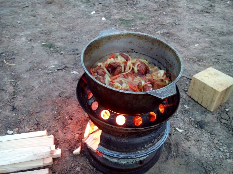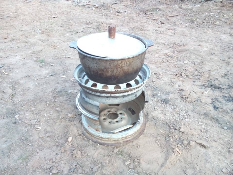 Казан на такой конструкции должен размещаться сверху по краю обода. В нижний отсек закладывают дрова. Пламя, поднимаясь, будет нагревать посуду до нужной температуры. В основном печь из колесных дисков применима для блюд, которые готовят на открытом огне: плова, супов, а также мяса по типу барбекю.