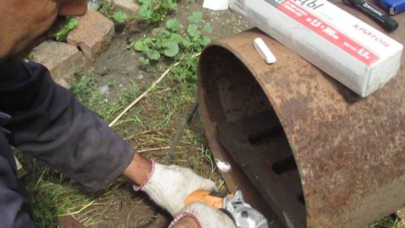 - Трубу Ø 20 см и длиной 35 см разрезаем пополам и завариваем торцы у одной половинки, ближе к середине прорезаем отверстие под дымоходную трубу (форма и диаметр должны совпадать).