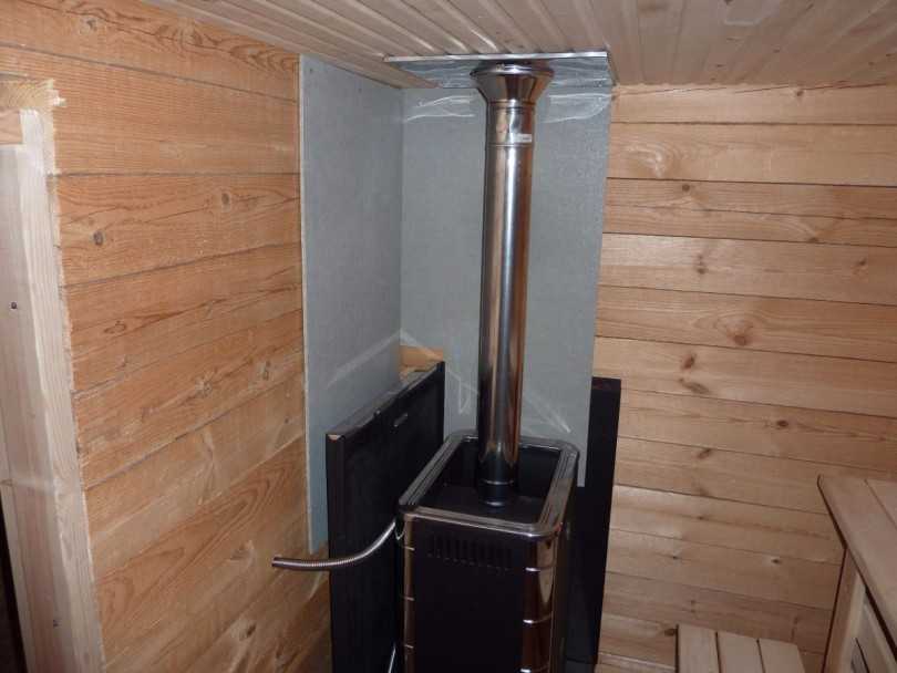 Для наружного варианта горизонтальный участок трубы не должен быть длиннее метра, иначе тяга будет очень слабой. Трубу дымохода у бани следует отвести от других конструкций, способных воспламениться, не менее чем на полметра. Закреплять трубу жестко в кровле не желательно. Кроме прочего следует учесть, что никаких стыков в районе потолка быть не должно по соображениям пожарной безопасности.
